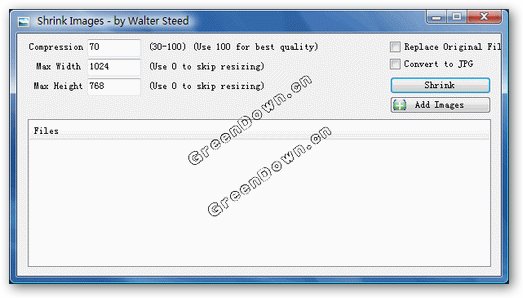 ShrinkImages V1.4 英文綠色免費版 ShrinkImages幫你縮小你的數(shù)碼圖片尺寸,選擇最大寬度/高度(或選擇不尺寸減少)。不用擔(dān)心縮小后您的照片的效果不好,就算縮的再小,您的照片的像素還是很好的,它支持圖片格式有:jpg,gif,bmp或tif