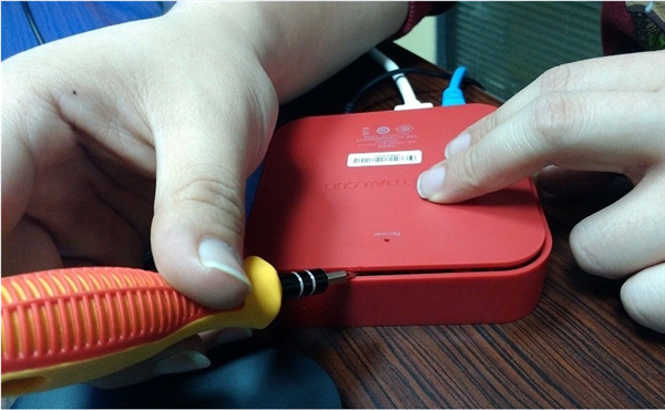 5.將圖示位置用金屬短路掉,保持短接,給盒子插上電源。天貓魔盒TMB100有3種型號,短路方法各不相同,在盒子底部可看到盒子型號