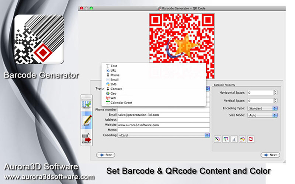 10.支持QRCODE文本,網(wǎng)址,電話,電子郵件,短信,聯(lián)系人,地理,WiFi,事件輸入,并與標志。