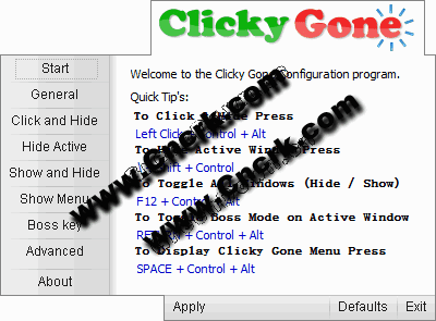 Clicky Gone V1.4.4.1 英文綠色便攜版 Clicky便攜式提供了一個(gè)快捷的方式來隱藏選定的應(yīng)用程序的窗口。只需按住用戶定義的鍵盤鍵并您要隱藏點(diǎn)擊的窗口標(biāo)題欄中。該程序也可以隱藏活動(dòng)窗口 ,并選擇啞的聲音,通過采用一種'老板'鍵盤快捷鍵