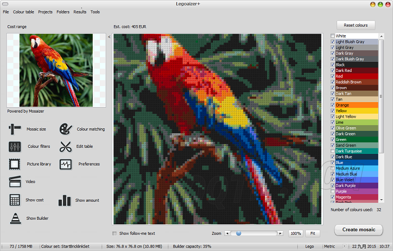 樂高積木化工具Legoaizer是一個(gè)免費(fèi)的應(yīng)用程序創(chuàng)建的圖像馬賽克藍(lán)圖用樂高積木和Ministeck部分。以最大限度地控制顏色,使用磚,磚的選擇和大小。