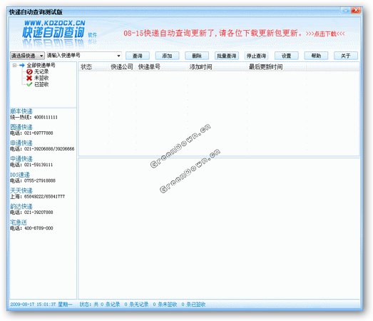 快遞自動查詢測試版 V1.0 簡體中文綠色免費版 快遞自動查詢是一款完全免費軟件,不存在任何功能或時間限制。適用于在網上開辦網絡商店的用戶使用,如:拍拍、淘寶、易趣、有啊、其他網站、ShopEx等網店賣家??爝f自動查詢顧名思議就是“自動”查詢快遞單號的貨物配送進度,目前支持網店主流快遞公司的快遞單號查詢(例如:順豐、申通、圓通、中通、天天、DDS、韻達、宅急送),有了快遞自動查詢幫助你節(jié)約了大量的時間,使你有更多的時間與顧客溝通,以此提高你的網店服務品質