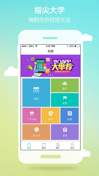 指尖大學(xué)是一款專門為大學(xué)生設(shè)計(jì)的一款手機(jī)應(yīng)用。在這里,你可以隨時(shí)隨地查看你的課程表,再也不會(huì)為不知道上課時(shí)間、地點(diǎn)而爆打舍友電話。在這里,你可以查詢你的考試成績(jī),再也不去擠那破敗不堪的學(xué)校教務(wù)系統(tǒng)。在這里,指尖快送的存在,讓你再也不用忍受那慢吞吞的外賣。指尖大學(xué),玩轉(zhuǎn)你的校園。【特色介紹】