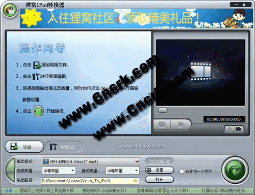 超級(jí)iPod轉(zhuǎn)換器功能強(qiáng)大,界面友好,是一款集成iPod視頻轉(zhuǎn)換及視頻編輯的轉(zhuǎn)換器。它可將幾乎所有的音頻及視頻格式轉(zhuǎn)換為蘋果iPod支持的MP4視頻格式。有了超級(jí)iPod轉(zhuǎn)換器,您可以隨時(shí)轉(zhuǎn)換最新的電影,短片,可以在ipod上盡情享受各類音視頻。超級(jí)iPod轉(zhuǎn)換器支持幾乎所有的音頻及視頻格式輸入,其中包括RM、RMVB、AVI、MPEG、MPG、DAT、VCD、SVCD、DVD、ASF、WMV、MOV、MP4、OGG、OGM、MKV等視頻文件,然后將其快速轉(zhuǎn)換成iPod支持的視頻格式,其特點(diǎn)有:轉(zhuǎn)換簡單、快速、高畫質(zhì),同時(shí)還可以支持批量添加文件轉(zhuǎn)換。超級(jí)iPod轉(zhuǎn)換器更突出的功能是視頻編輯功能,在iPod轉(zhuǎn)換設(shè)置中,您可以對(duì)輸入的視頻文件進(jìn)行可視化編輯,例如:裁剪視頻,截取部分視頻轉(zhuǎn)換,把不同視頻合并成一個(gè)文件輸出,調(diào)節(jié)視頻亮度,對(duì)比度等