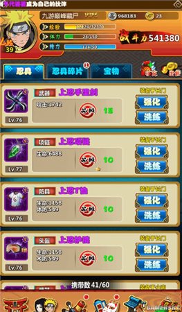 5、每名上陣忍者可裝備頭盔、武器、項鏈、防具各一樣,同時還可裝備奧義和戒指各一樣。