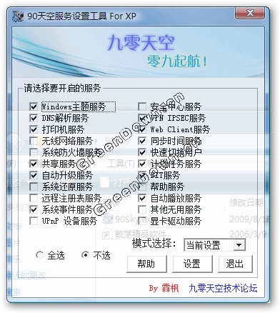 九零天空服務(wù)設(shè)置工具 V1.0 簡體中文綠色免費版 本程序旨在設(shè)置Windows系統(tǒng)服務(wù),支持當(dāng)前服務(wù)啟動設(shè)置的讀取,細分了22個系統(tǒng)服務(wù).并提供了極速游戲型、高速游戲型、安全辦公型、局域網(wǎng)型、筆記本型、XP默認型服務(wù)配置方案,能提供初學(xué)者簡單的服務(wù)設(shè)置方案