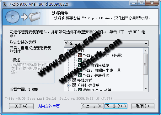 7-Zip V9.12 Beta(Ansi編譯版) 完全漢化安裝版 7-Zip是一款號稱有著現今最高壓縮比的壓縮軟件,它不僅支持獨有的7z文件格式,而且還支持各種其它壓縮文件格式,其中包括ZIP, RAR, CAB, GZIP, BZIP2和TAR。此軟件壓縮的壓縮比要比普通ZIP文件高30-50%。因此,它可以把經WinZip壓縮的文件再壓縮2-10%。