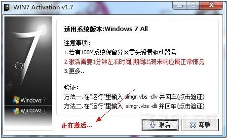 第三步:點(diǎn)擊激活按鈕之后,軟件會(huì)自行開始激活WIN7操作系統(tǒng),等待一會(huì)