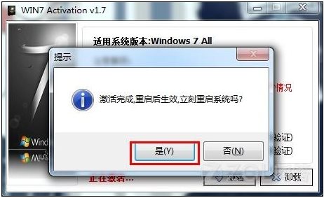 第四步:1分鐘左右之后,激活完畢,軟件會(huì)提示激活完成,是否立即重啟系統(tǒng),點(diǎn)是