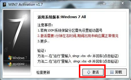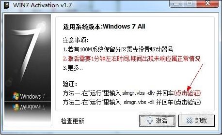 第五步:重啟系統(tǒng)之后,再次打開WIN 7 Activation v1.7程序,此時(shí)已經(jīng)激活完畢,點(diǎn)擊括號(hào)里的驗(yàn)證