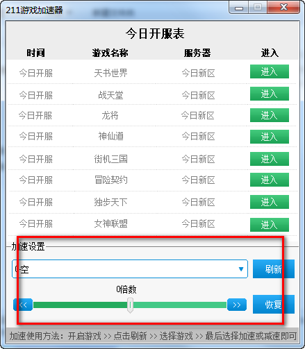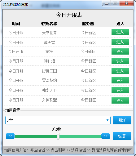運(yùn)行“211游戲加速器”,打開游戲后點(diǎn)擊加速器中的“刷新”按鈕,然后選擇游戲,最后選擇加速或減速即可。【211游戲加速器功能介紹】