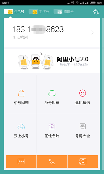 下載阿里小號即可輕松實現(xiàn)雙卡雙待,擁有一個全新的真實號碼。給手機穿上一件隱私馬甲。移動、聯(lián)動、電信等任何運營商的用戶均能每月免費隨機領用3次小號??烧=哟螂娫?、收發(fā)短信。遇到陌生人、交友、租房、買賣房屋、醫(yī)療、生育、二手交易、找工作、打車、與朋友嬉鬧、調(diào)研、查崗等場景。給小號,保護真實號碼,杜絕騷擾,絕對安全!阿里小號上線后獲得了中關村在線、新華網(wǎng)、新浪科技、網(wǎng)易科技、鳳凰網(wǎng)、21cn、techweb、手機中國等多家媒體的推薦。