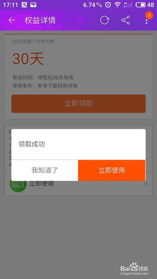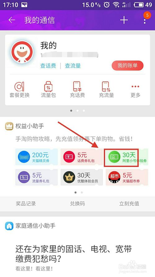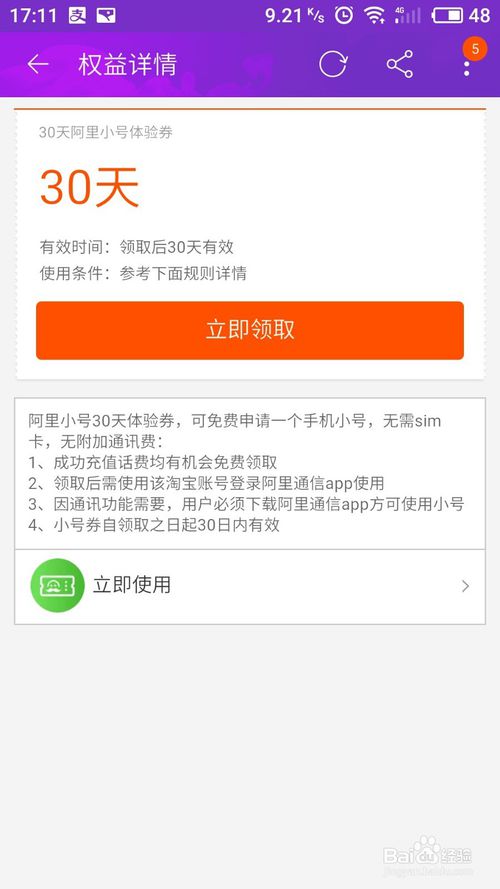 在“更多服務”頁面下,可以看到“30天阿里小號體驗卷”,點擊