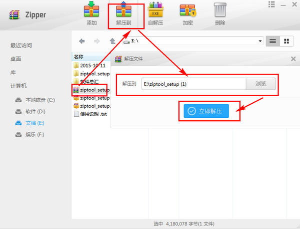 選擇你要解壓的文件==點擊解壓到==選擇盤符==點擊立即解壓