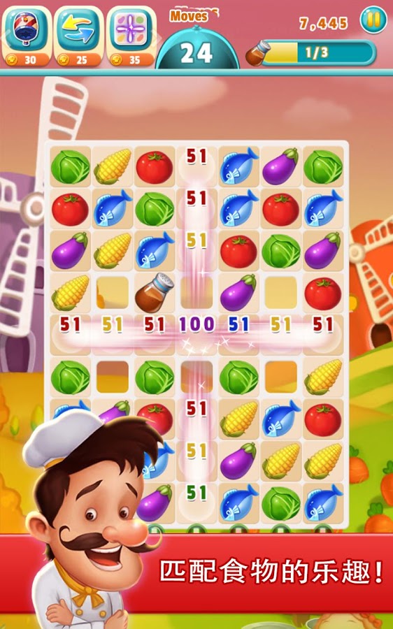 在三消游戲前仆后繼的今天,消除類游戲要么與星星掛鉤,要么就與糖果擦邊,那我們《大廚》可就不一樣,消除蔬菜,健康每一天~草綠色為主色調(diào)的畫面,代表著清爽活力的一天又開始啦!點擊胖乎乎的小按鈕開始烹飪!圓胖圓胖的茄子、番茄、包菜、玉米映入眼簾,咦還有小魚來湊熱鬧,好吧有葷有素才是一桌營養(yǎng)餐對不對?