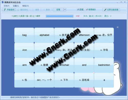 一款基于經(jīng)典游戲『連連看』的單詞強(qiáng)化記憶軟件。跳跳熊單詞連連看讓您在開(kāi)心娛樂(lè)的同時(shí)提升對(duì)英語(yǔ)的學(xué)習(xí)興趣,對(duì)學(xué)習(xí)英語(yǔ)有非常不錯(cuò)的效果。