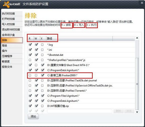 于是,我設(shè)定了只排除執(zhí)行,不排除讀取與寫入。意思就是,當(dāng)執(zhí)行Foobar2000安裝文件夾下內(nèi)容時(shí)不監(jiān)控;但對其讀取和寫入時(shí),仍然監(jiān)控。如圖: