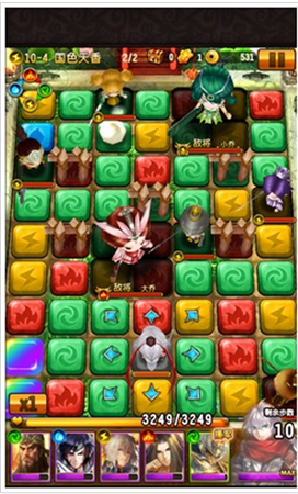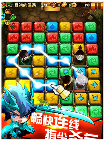 1、 連線戰(zhàn)斗通過連接同色地塊,即可率領(lǐng)武將前進(jìn),并砍殺路徑上的敵人。連線地塊越多,攻擊效果加倍,積累一定數(shù)量更能觸發(fā)連鎖技,酸爽連擊可一波帶走全盤敵將喔!