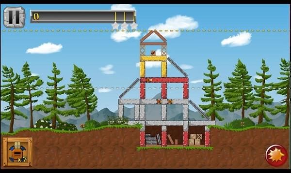 游戲中你需要根據(jù)關(guān)卡給出的不同建筑合理的擺放炸藥,以一次爆炸摧毀建筑為目標(biāo)進(jìn)行布置,你會(huì)發(fā)現(xiàn)不同類型的對(duì)象的破壞:不同的阻力,玻璃,木材,包裝箱和堅(jiān)不可摧的鋼筋磚。