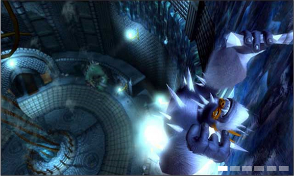 出洞后啥都別打 一路前進到開闊的場地。會出現(xiàn)大量敵人(必須殺光),其中還有鐵球怪,打法是隨意攻擊他,變成球體后主角變身成烏龜人按RT沖撞鐵球怪,把他沖到懸崖下!有扇門需要主角變身雪人使用LT技能(冰劍)對準紅心射擊,最后變身草人使用LT+RT鉆進去。