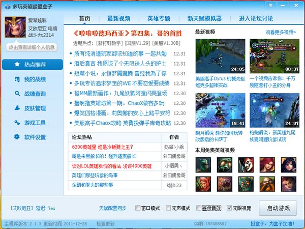 下載好了之后,選擇你的游戲所在路徑,如 e:/英雄聯(lián)盟然后點(diǎn)確定就可以打開(kāi)盒子的界面了,點(diǎn)盒子上的啟動(dòng)游戲,進(jìn)游戲之后就會(huì)有盒子的戰(zhàn)報(bào)功能,錄像功能可以用了 在啟動(dòng)游戲之前還可以點(diǎn)盒子界面上的皮膚管理設(shè)定你喜歡的英雄皮膚。