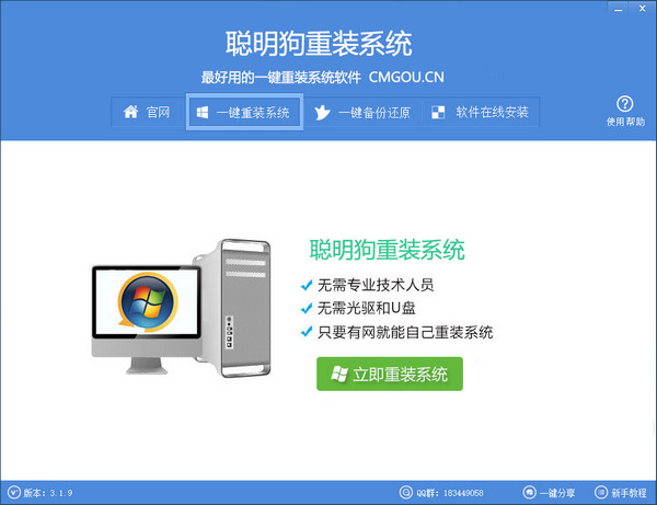 聰明狗一鍵重裝系統(tǒng)是一款針對系統(tǒng)重裝的工具,目的是為了讓所有用戶能自己重裝系統(tǒng),不用把電腦搬到電腦售后服務(wù)中心去,我們把復(fù)雜的重裝系統(tǒng)的步驟交給聰明狗一鍵重裝系統(tǒng)去完成,我們只需要一鍵就能夠安裝屬于自己的系統(tǒng)。