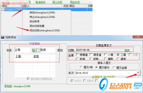 1、全自動(dòng)搶票選擇出發(fā)地、目的地、出發(fā)日期,一鍵開(kāi)刷