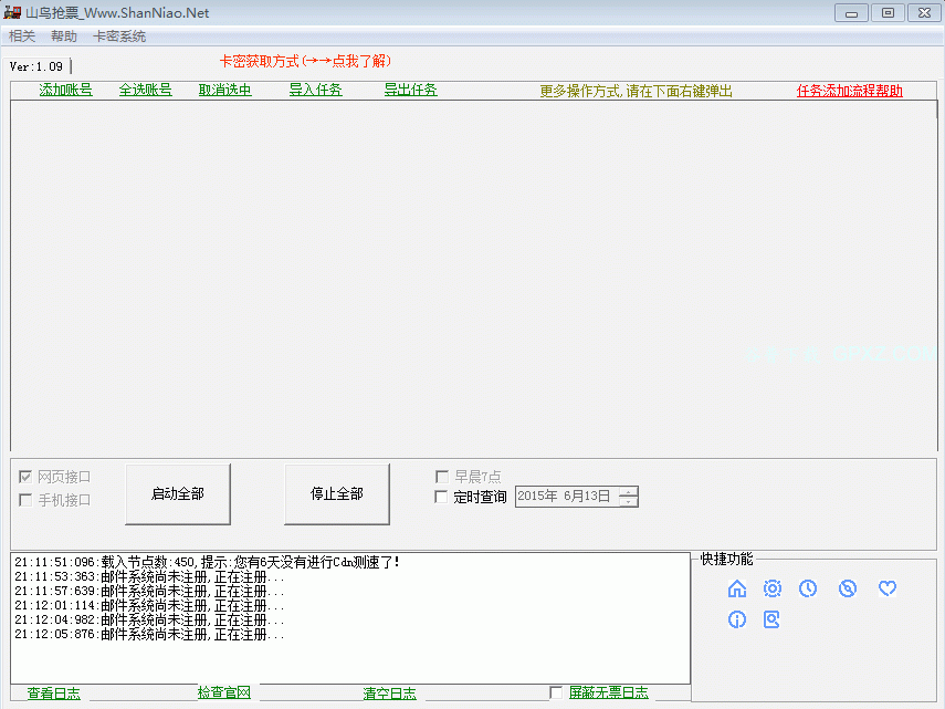 山鳥(niǎo)搶票是一款專門幫助大家進(jìn)行12306搶票的免費(fèi)自動(dòng)訂票搶票軟件,這款山鳥(niǎo)搶票軟件可以幫你解放雙手,全程自動(dòng)搶票、自動(dòng)識(shí)別驗(yàn)證碼、支持多線程秒單、穩(wěn)定撿漏票、支持多用戶、支持多天、多車次、多席別、多乘客等多項(xiàng)選擇,為您的出行提供最貼心的保障,歡迎免費(fèi)試用這款山鳥(niǎo)搶票軟件!
