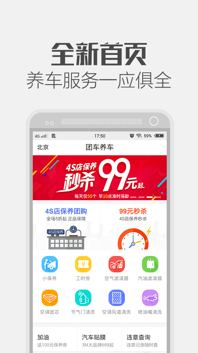1、【首頁】全新首頁,養(yǎng)車服務(wù)一應(yīng)俱全2、【保養(yǎng)】4S店保養(yǎng)團(tuán)購,低至5折