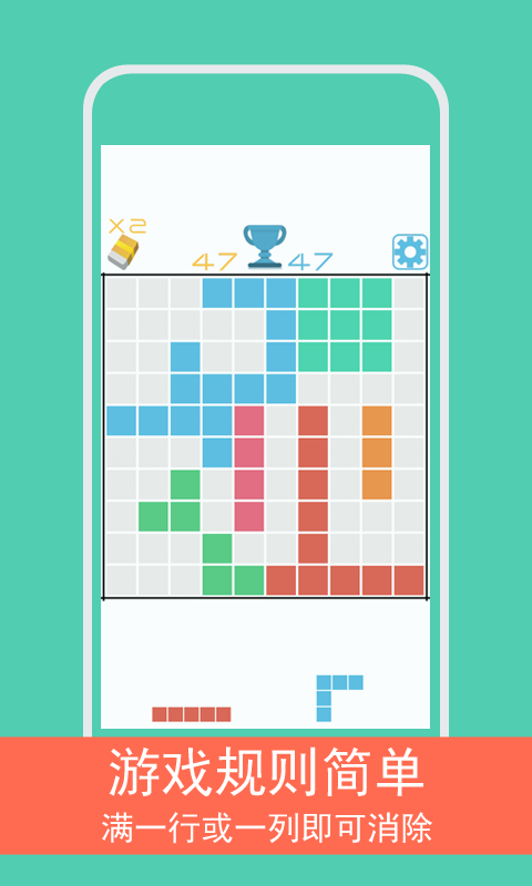 兒時(shí)的經(jīng)典游戲還記得嗎?和單調(diào)的黑白俄羅斯方塊說拜拜吧,《方塊1010+》亮麗的色彩搭配,簡單的10*10棋盤格,打破俄羅斯方塊的邏輯玩法,彩色方塊組合可以自行手動(dòng)放置,而不是被動(dòng)落下,是否相同顏色的才會(huì)消除?NO,只要湊滿一行或者一列就可以消除,良心之作,嗨起來吧。