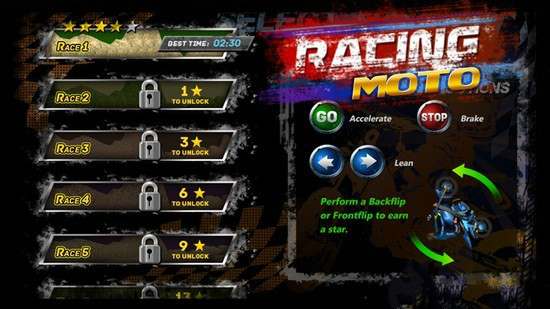 山地摩托車(Racing Moto)是一款山地越野的摩托車特技比賽游戲。山地摩托車游戲里設(shè)計(jì)了各種極高難度的摩托車空翻特技,不過(guò)游戲的操控難度不是很大,主要通過(guò)屏幕上的虛擬按鍵來(lái)控制摩托車。