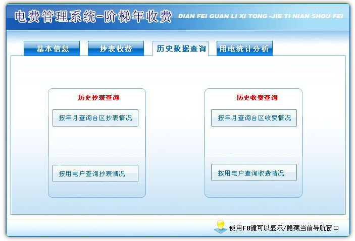 3、歷史數(shù)據(jù)查詢(歷史抄表查詢(按年月查詢臺(tái)區(qū)抄表情況、按用電戶查詢抄表情況))和歷史收費(fèi)查詢(按用電戶查詢收費(fèi)情況、按年月查詢臺(tái)區(qū)收費(fèi)情況));