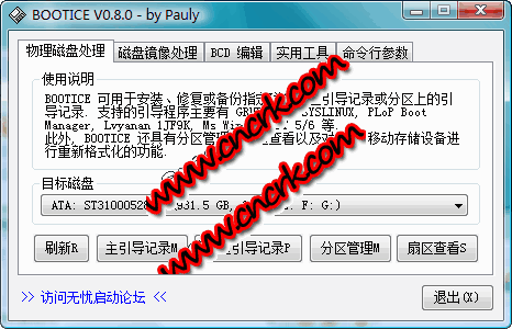 BOOTICE 是一個啟動相關(guān)的維護(hù)的小工具,主要用于安裝、修復(fù)、備份和恢復(fù)磁盤的 MBR(Master Boot Record)或分區(qū)上的 PBR(Partition Boot Record),以及查看編輯 Windows Vista/7 的 BCD,此外還具有磁盤分區(qū)管理,對可移動磁盤的重新分區(qū)和格式化功能。