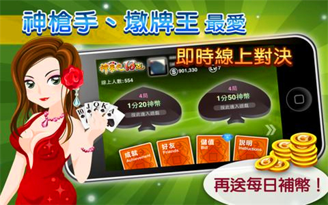 《神來也13支》經(jīng)典打槍玩法,1,000萬玩家,多人連線,湊桌超快,智慧牌組提示+自行選牌=賭神就是你,三同花、三順子、湊一色,多樣化Bonus牌型,精彩動(dòng)畫比牌,輸贏更刺激!