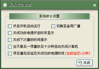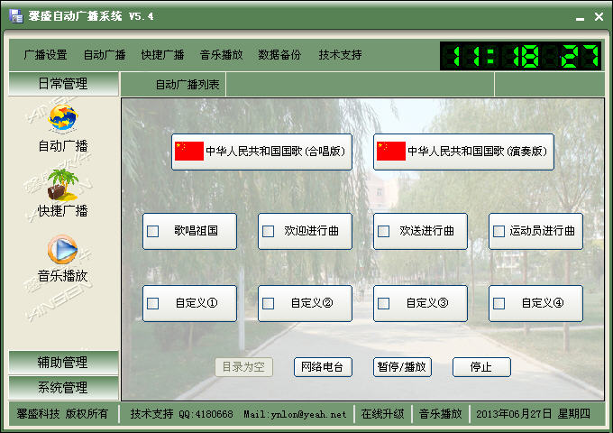 新版功能:1、增加節(jié)假日跳過播放的功能,避免節(jié)日沒有人的時候廣播還在那里廣播的現(xiàn)象; 2、快捷播放按鈕由之前的8個增加到16個; 3、目錄播放打破只能播放一個的限制,可以設(shè)置多個,在不同的預(yù)訂項(xiàng)目中播放不同文件夾中的音樂; 4、取消內(nèi)置網(wǎng)絡(luò)電臺,全部由自己添加,添加后可作為播放項(xiàng)目播放