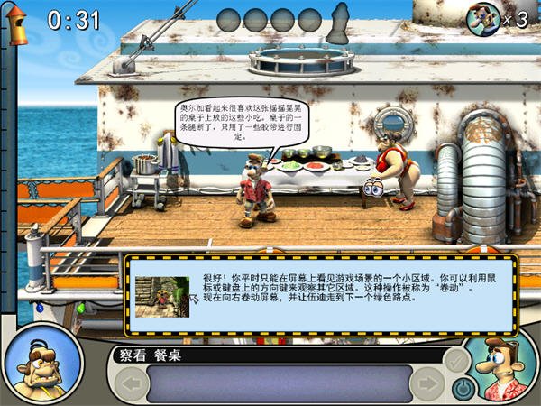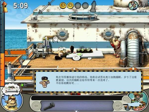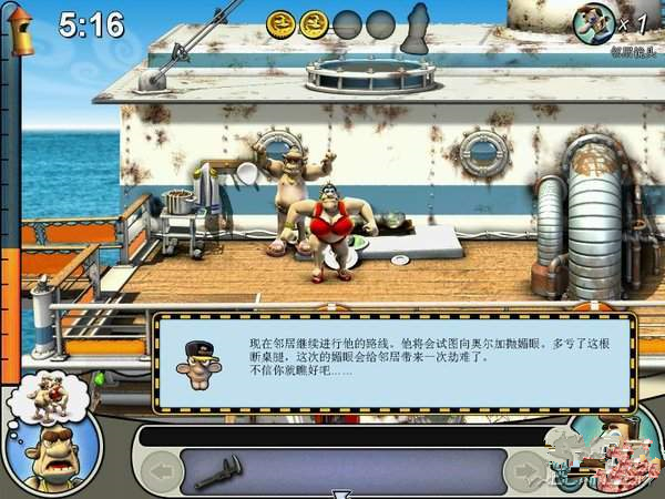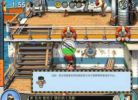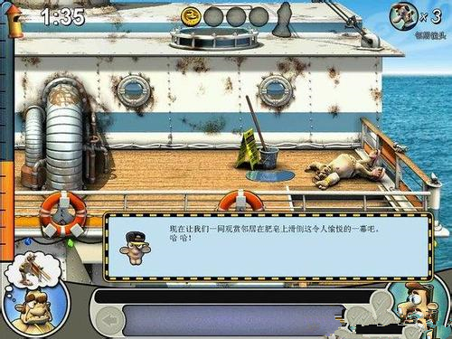 物品:鐵鉤,硬幣,香腸(船底艙),芳香丸(右下小便池內(nèi)),滅火器(右上),鐵銼(右上皮包內(nèi),先把香腸給狗吃,然后才能拿),壓縮氣瓶(左下)流程:先把壓縮氣瓶裝在小孩的喇叭上,然后再拿一個壓縮氣瓶-〉老頭離開左上,到左上,把芳香丸放到老頭吃的糖果里,用鐵銼把廁所的標識調(diào)換,然后把鐵鉤裝在魚竿上-〉到左下,用鐵銼把救生艇的繩子弄一下-〉到右下,把壓縮氣瓶放在救生衣上,把滅火器和氧氣瓶調(diào)換一下-〉等待時機,回到左上給老頭打電話(這個時候老頭應(yīng)該剛剛被滅火器整完,開始上樓),收工~