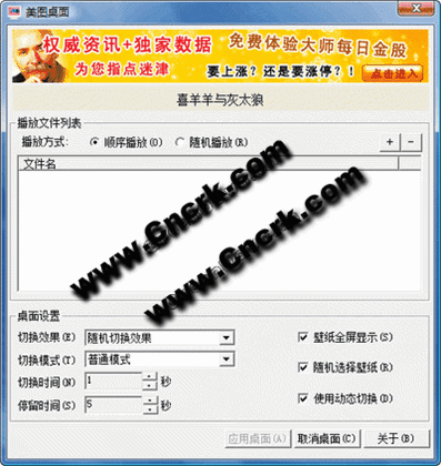 美圖桌面是一款動(dòng)態(tài)設(shè)置桌面的軟件,她支持bmp,jpg,jpeg,png等幾乎所有流行的圖片格式,您只需要將你需要的桌面圖片拖動(dòng)到軟件的圖片列表中(本軟件支持直接導(dǎo)入圖片文件夾),簡(jiǎn)單的設(shè)置幾個(gè)參數(shù),就能夠享受到動(dòng)態(tài)切換桌面的視覺(jué)享受.