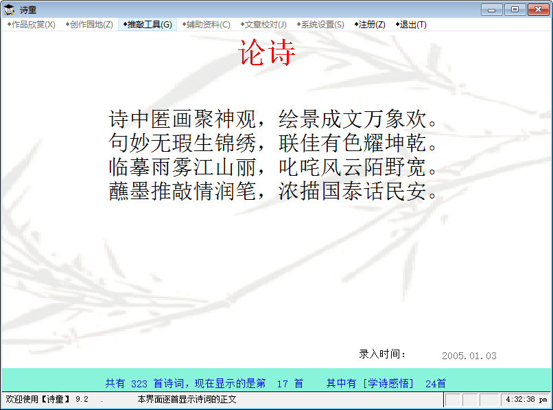 1. 作品管理:可以方便的將自己的詩詞作品整理成“電子詩集”。使用【】陸續(xù)輸入自己的作品后。