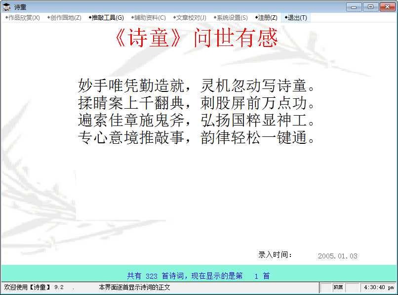 詩童是一款詩詞管理軟件,特別適合詩詞愛好者管理自己的詩詞作品、在[詩童]的協(xié)助下創(chuàng)作新作品、也可搜集整理自己喜愛的詩詞作品。具有詩詞作品管理、格律檢驗(yàn)、字詞句多能寶典、制作電子詩集等功能??梢苑奖愕拇蛴≥敵龌驈?fù)制到你正在編輯的其他文本中。下載后即可欣賞到軟件作者的詩詞作品,可以試用格律檢驗(yàn)、字詞句寶典。如果感覺好用,交費(fèi)注冊后就成為你自己詩詞的好管家。【軟件特點(diǎn)】
