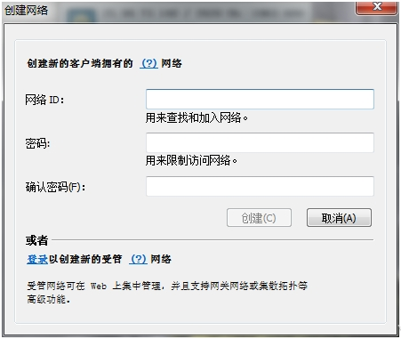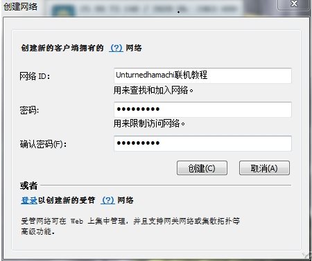 輸入網(wǎng)絡(luò)ID(相當(dāng)于這個(gè)網(wǎng)絡(luò)的名字)和密碼,然后點(diǎn)擊創(chuàng)建。