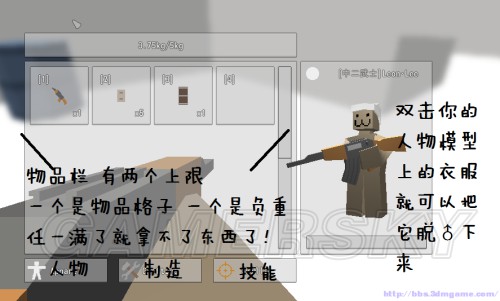 物品欄如上圖是有負(fù)重和物品格子的。而增加的方法和Dayz一樣穿背包。目前為止發(fā)現(xiàn)的背包大小如下:(英文名忘了魂淡?。?br />小雙肩包-書(shū)包-灰色旅行包-黃棕色的不知名包-綠色軍用背包-灰色大背包