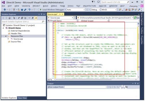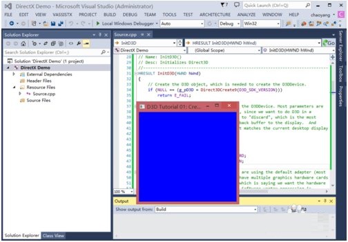 在安裝路徑D:\Program Files (x86)\Microsoft DirectX SDK (June 2010)\Samples\C++\Direct3D\Tutorials\Tut01_CreateDevice中打開(kāi)下圖的文件,并將其中的代碼復(fù)制到上圖中的代碼區(qū)