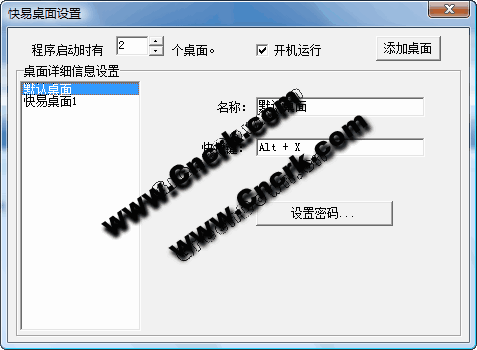 可以同時創(chuàng)建多個桌面,很方便的在多個桌面上來回切換,支持快捷鍵,可以設置密碼。比如,您可以在一個桌面上娛樂,炒股,玩游戲,在另一個桌面上打開工作的窗口,當別人來的時候,你按下快捷鍵就可以快速的切換到工作的窗口了。很適合上班族,游戲族,炒股族使用