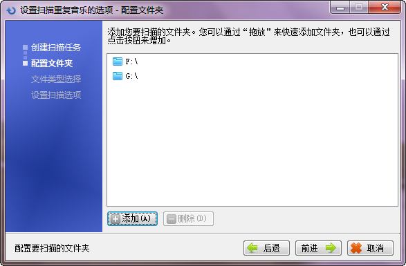 設(shè)置要掃描的文件夾。可以通過“添加”來(lái)添加,也可以從資源管理器中直接拖放文件夾到這個(gè)窗口來(lái)添加。