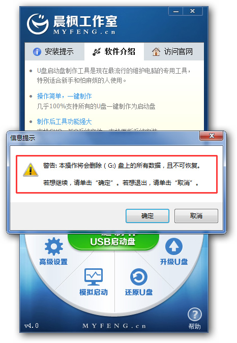 程序會(huì)提示是否繼續(xù),確認(rèn)所選U盤(pán)無(wú)重要數(shù)據(jù)后點(diǎn)是開(kāi)始制作.