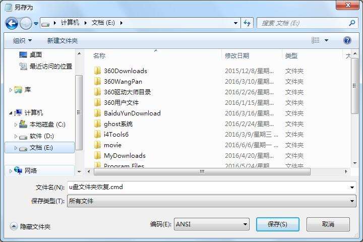 3、在彈出的保存窗口中,將保存類型改為所有文件,新建文件名,文件名后綴為“.cmd”,保存路徑隨意。如圖所示: