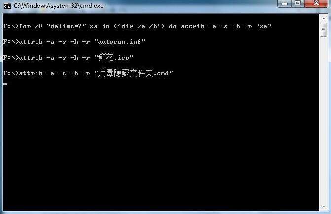 5、最后雙擊運(yùn)行腳本命令,等待運(yùn)行完畢,u盤(pán)內(nèi)被隱藏的文件就都回來(lái)了,如圖所示: