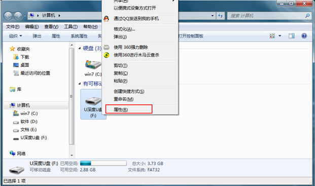 1、將無(wú)法掃描的u盤(pán)連接到電腦上,并在計(jì)算機(jī)總找到u盤(pán)圖標(biāo),并右擊打開(kāi)它,選擇“屬性”選項(xiàng)。