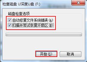 3、把“自動(dòng)修復(fù)文件系統(tǒng)錯(cuò)誤”和“掃描并嘗試恢復(fù)壞扇區(qū)”兩個(gè)選項(xiàng)勾選起來(lái),并點(diǎn)擊“開(kāi)始”。