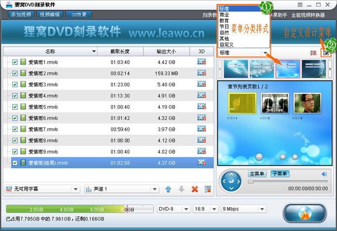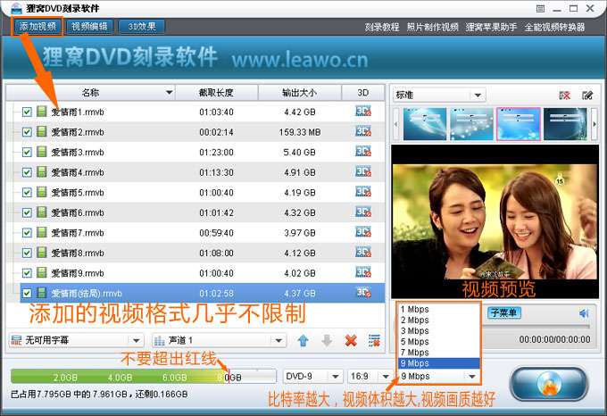 可以設置軟件主界面下方的DVD類型(DVD-5/DVD-9),視頻寬高比(4:3/16:9),視頻比特率(1/2/3/5/7/9Mbps)。其實DVD-9的容量比DVD-5的容量大;比特率數(shù)值越大,視頻相對畫質越好,視頻文件也越大。